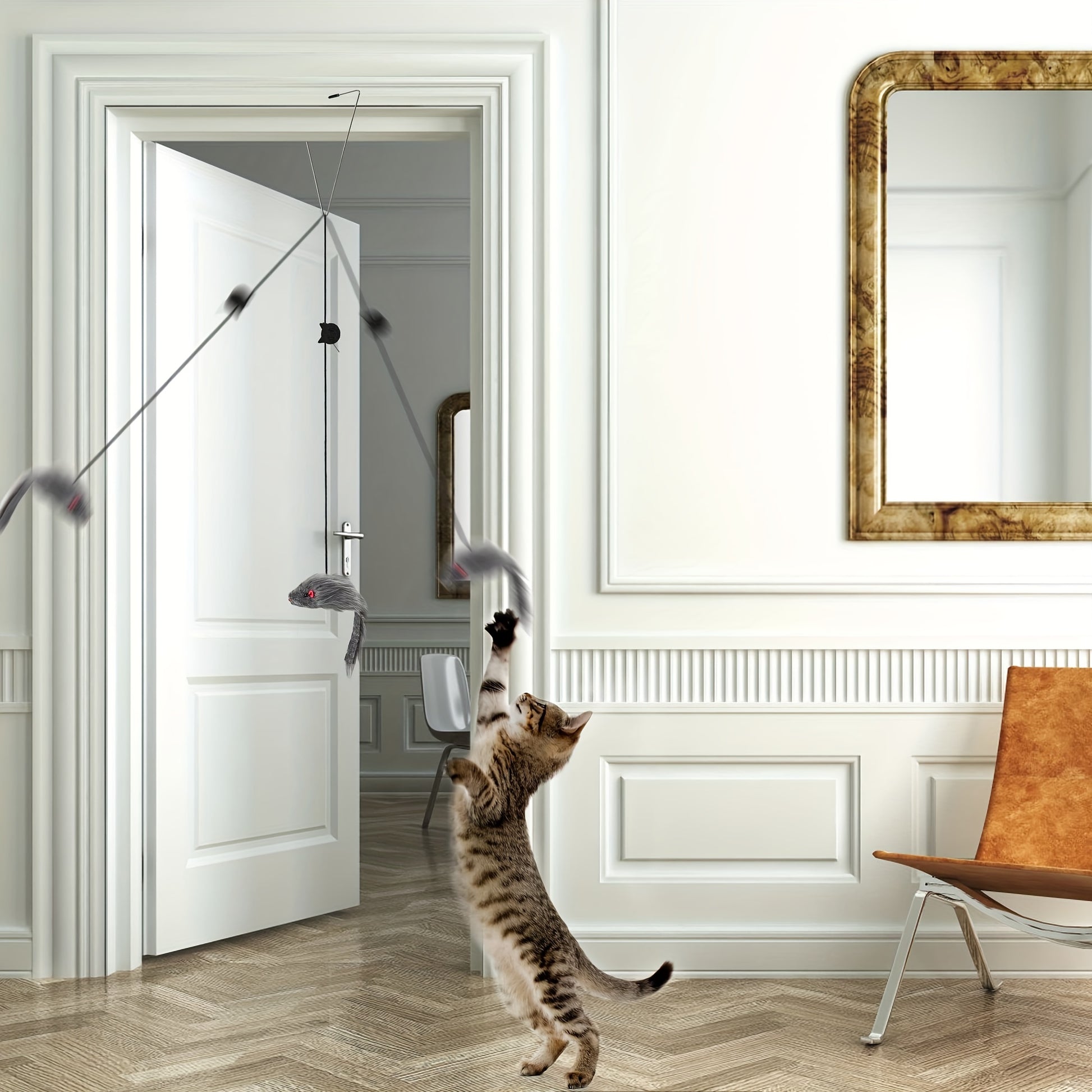 Welcome to our store! Our adjustable hanging cat toy set is designed to bring hours of interactive teasing and playful fun to your feline friend. With two pieces included, this set offers variety and excitement for your cat's entertainment. The adjustable design allows you to customize the height and configuration of the toys to suit your cat's preferences. Watch as your cat pounces, bats, and jumps to catch the dangling toys, providing both mental and physical stimulation. Say goodbye to boredom and hello to endless fun with our adjustable hanging cat toy set. Upgrade your cat's playtime experience today!